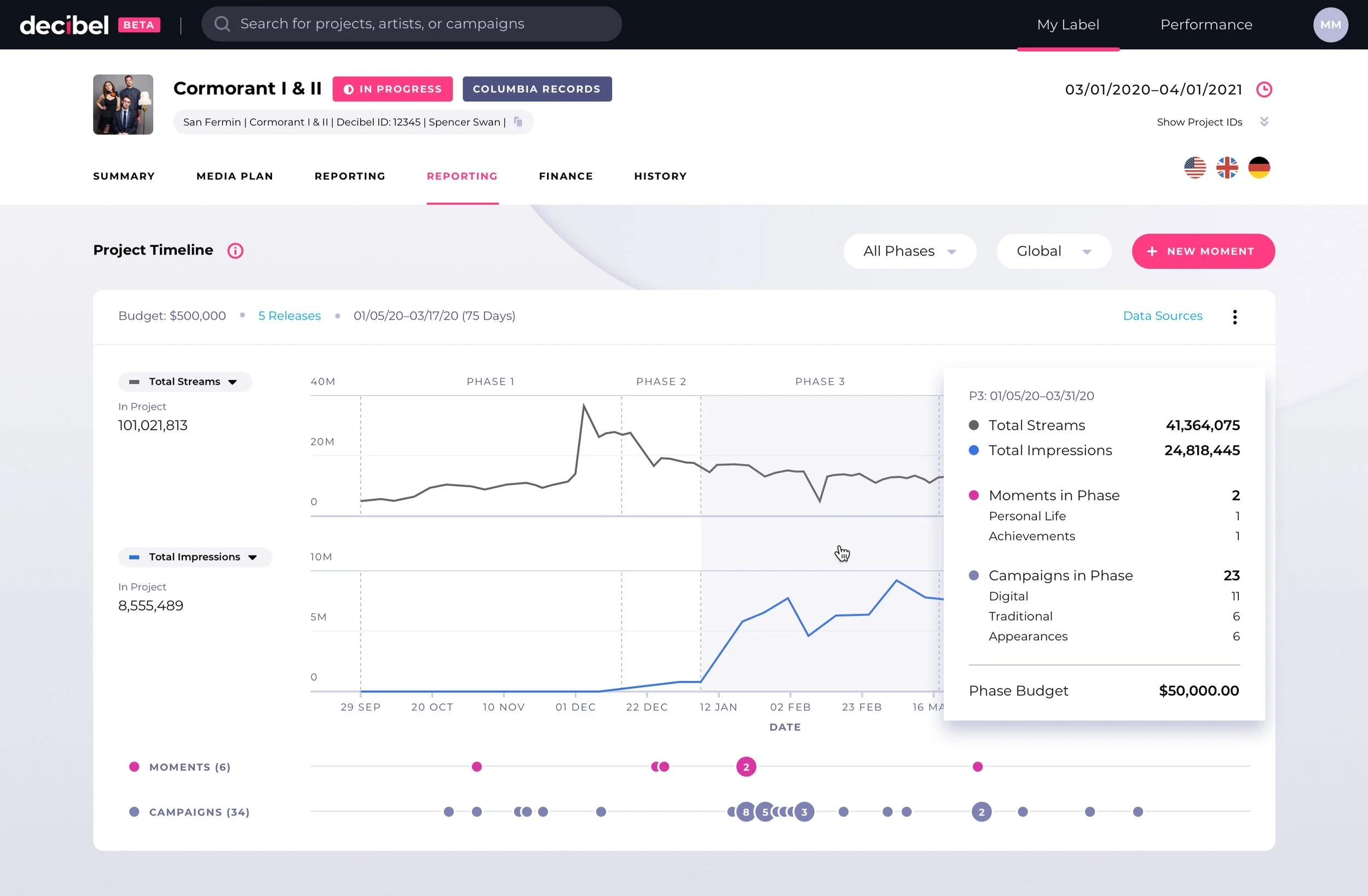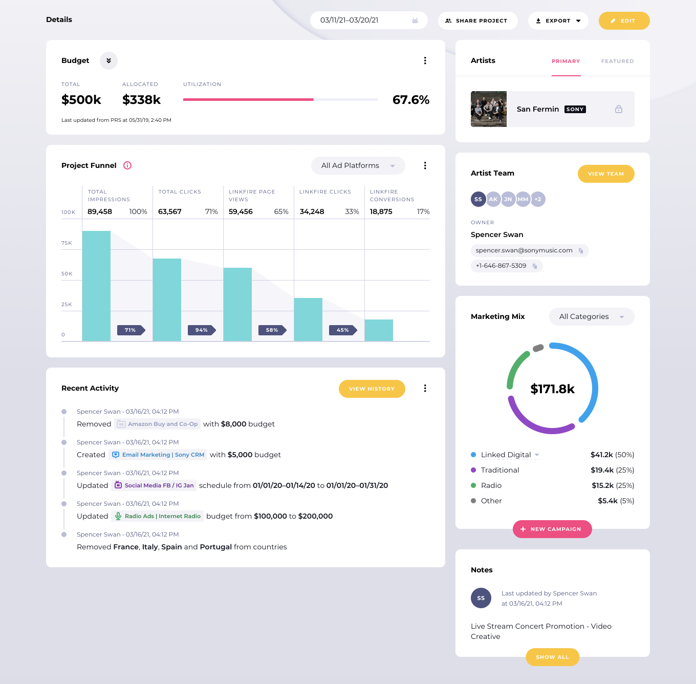 Marketers and marketing leaders at each label could get a bird’s eye view on their whole project’s performance, including key financial info, a full funnel of ad-related events, and a marketing mix breakdown.