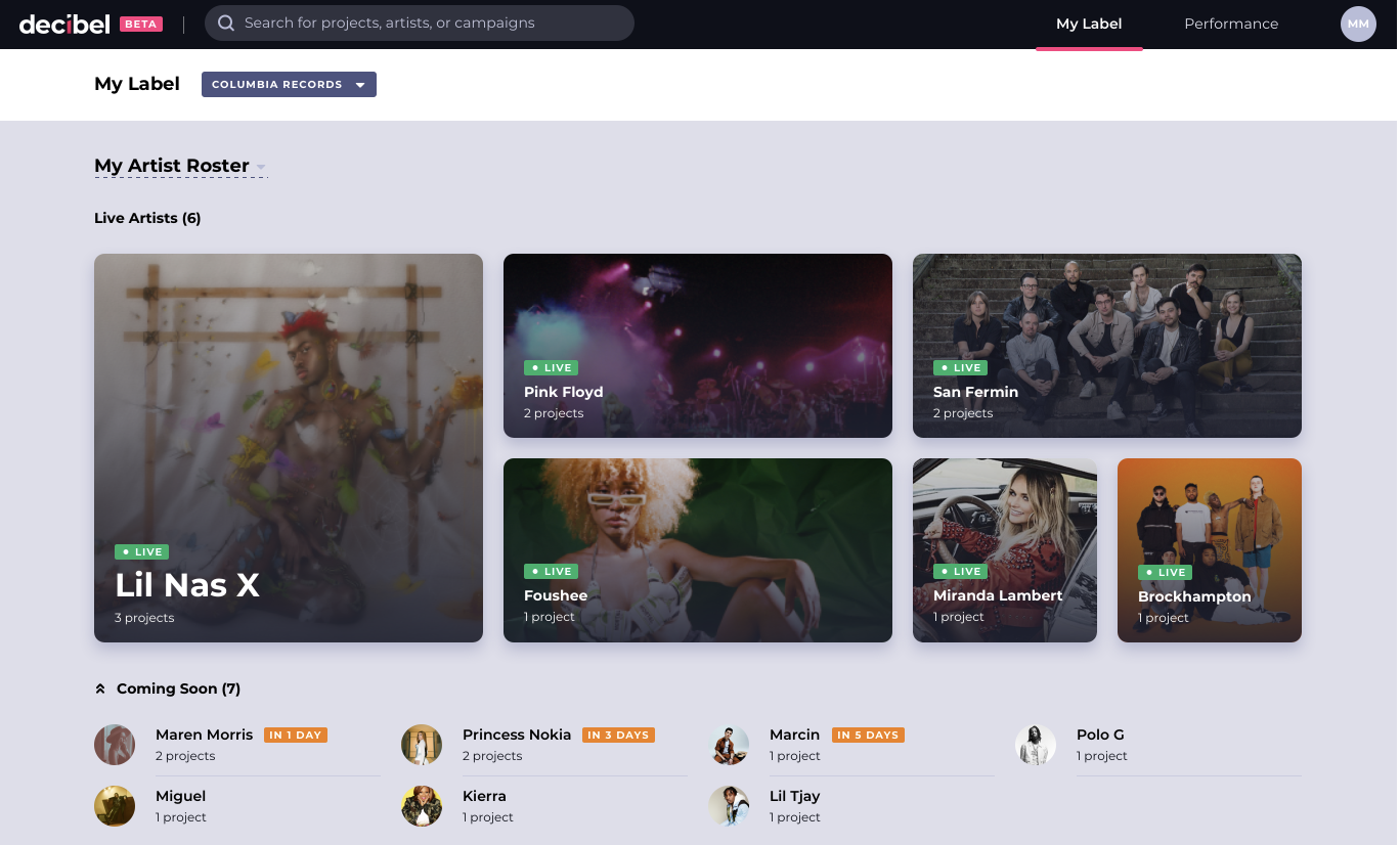 The home page shows live artist projects coupled with those that marketers might need to prepare to launch soon.