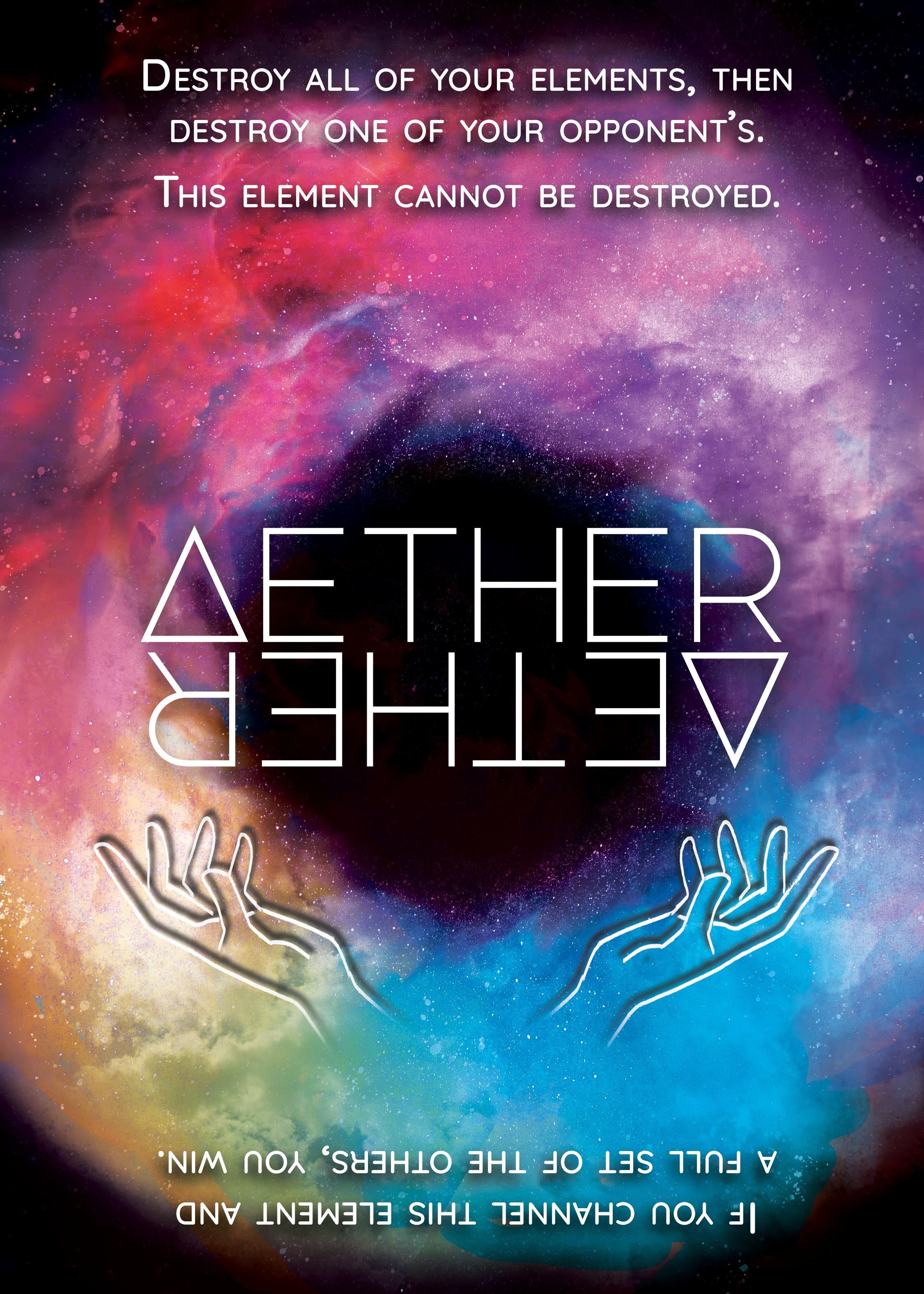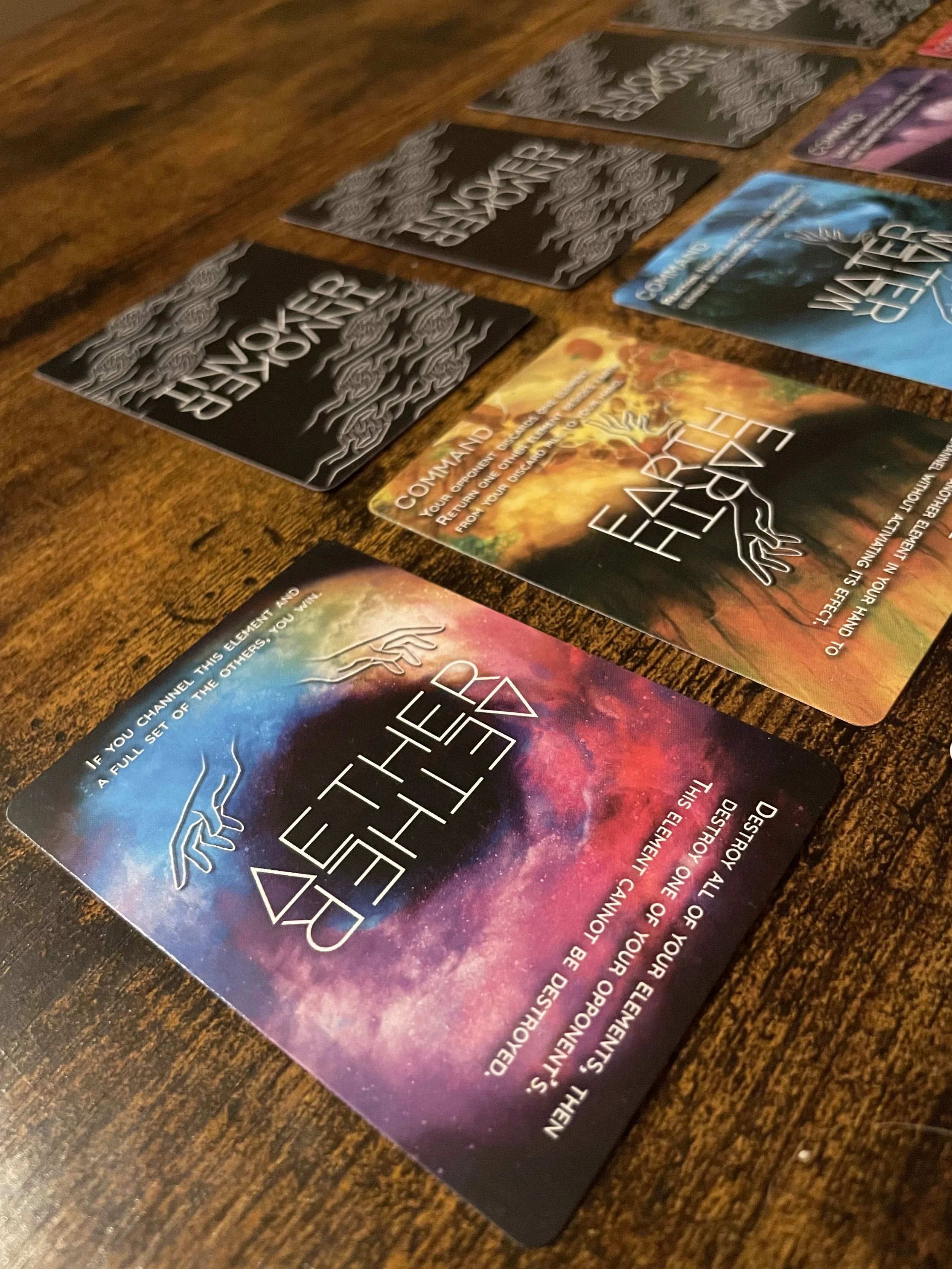 Invoker is a competitive two player duel designed to be completed in less than 10 minutes. Players each embody elementalist apprentices who first seek to gain knowledge of air, earth, fire, and water, then must choose to master or one or all before their opponent. Each card has two effects, a destructive “Command” ability triggered by discarding it and a constructive “Channel” ability that advances the player towards elemental mastery.