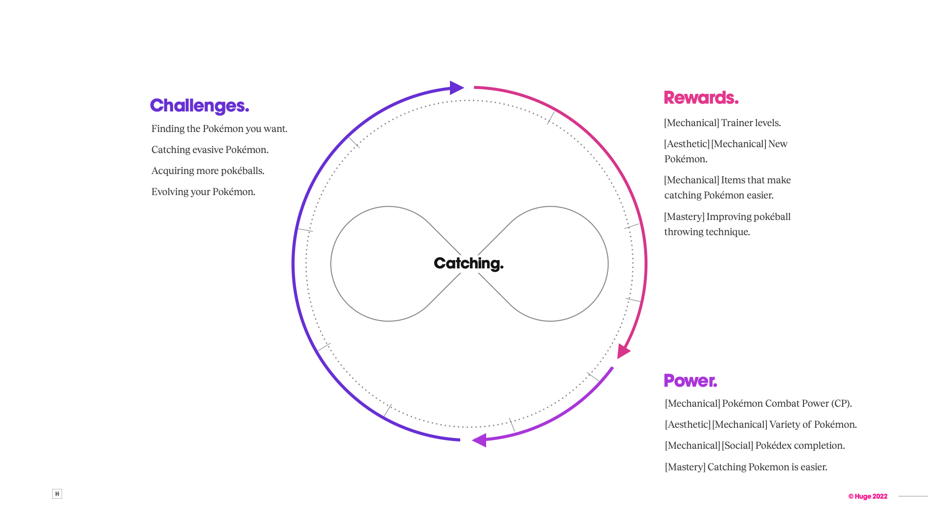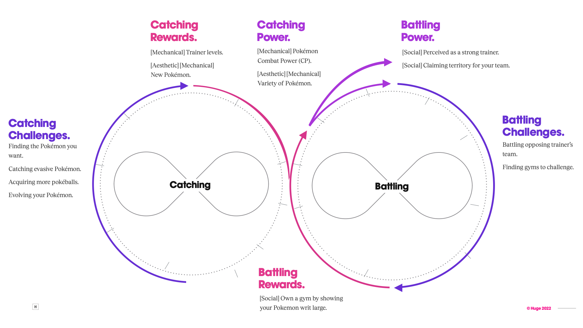 There were two primary loops in Pokémon Go when it came out in 2016, which link together to create the larger game system. The first is catching Pokémon and the second is battling Pokémon. You can only battle with Pokémon after you catch them, so naturally catching is an input to the battling loop.